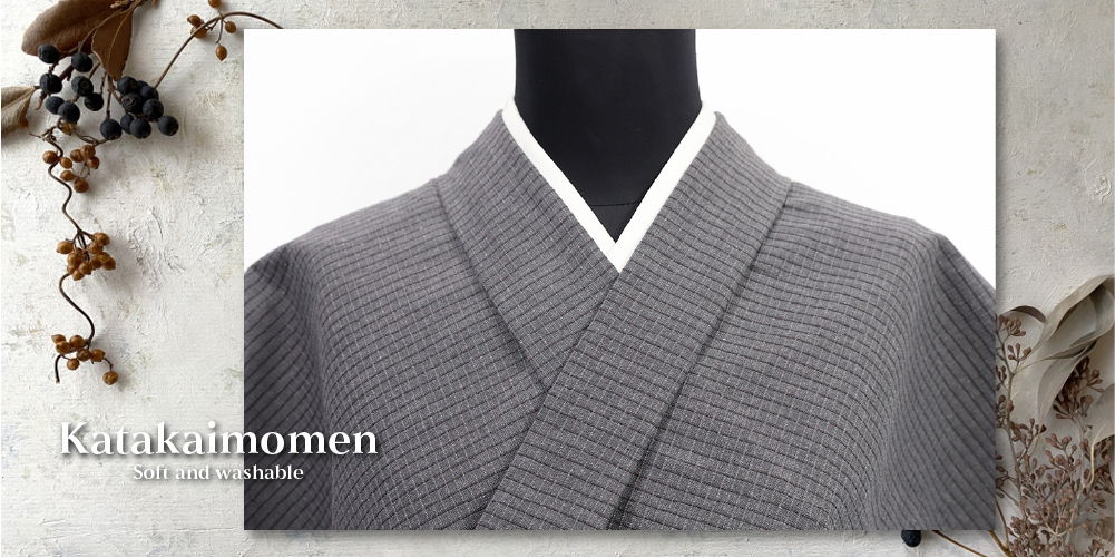 片貝木綿 綿麻着物 紺仁工房 紅梅織 普段着きもの 格子 灰色