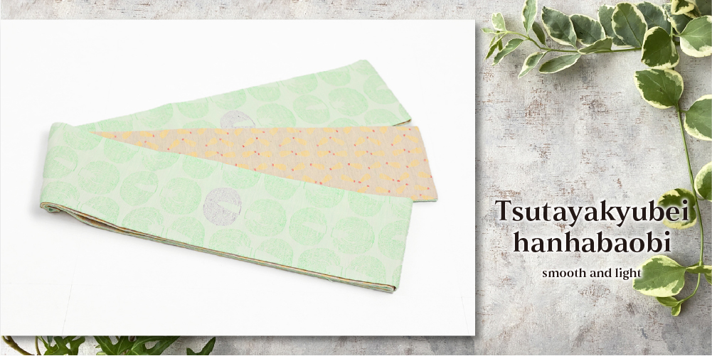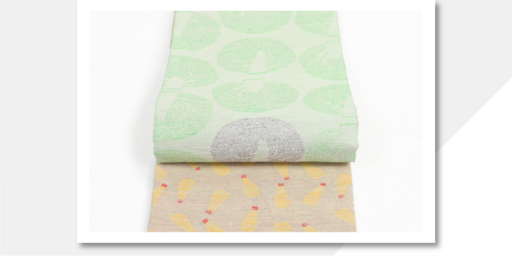 京都西陣、蔦屋久兵衛の遊び心のある絹麻両面半幅帯をお届けします。