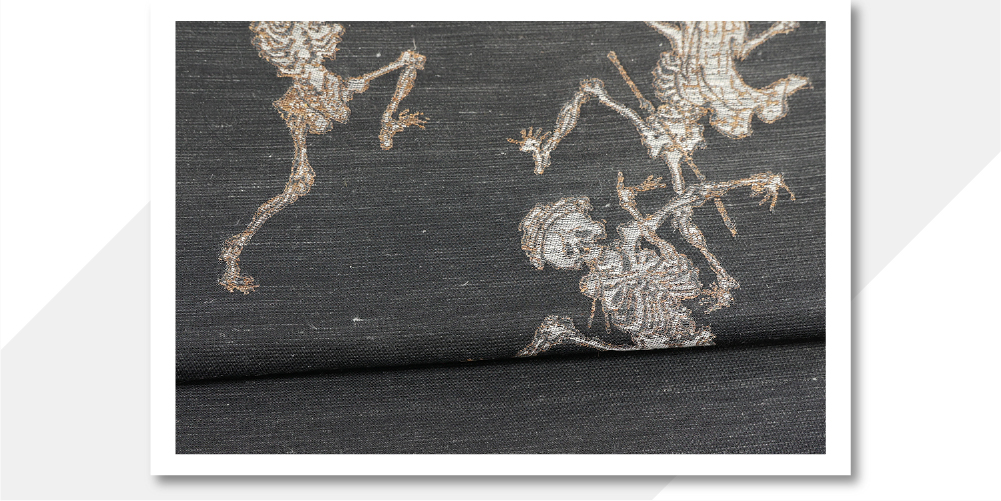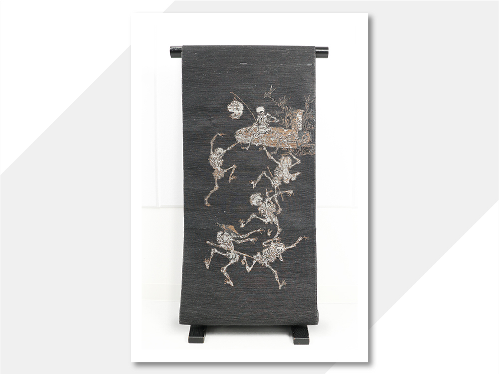 蔦屋久兵衛 絹麻 九寸名古屋帯 河鍋暁斎 踊り骸骨 チャコールグレー