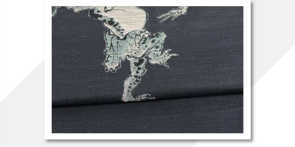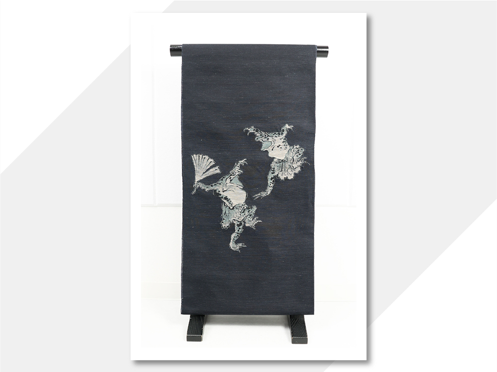 蔦屋久兵衛 絹麻 九寸名古屋帯 河鍋暁斎 カエルの踊り チャコールグレー