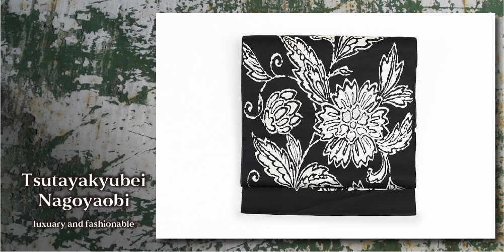 蔦屋久兵衛 絹麻 九寸名古屋帯 ラメ 更紗 黒×白銀