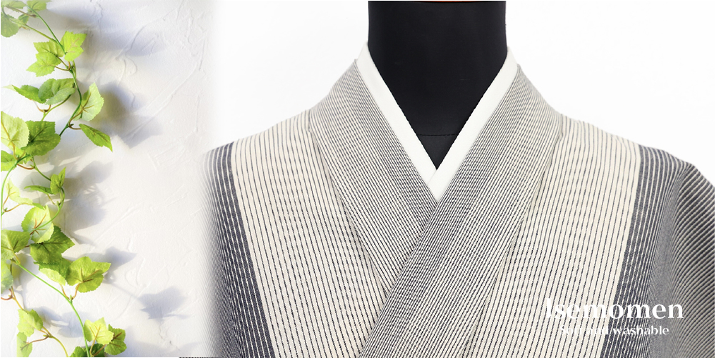 伊勢木綿 木綿着物 綿麻 縞 灰色×白 ◆背の高い人にオススメ◆