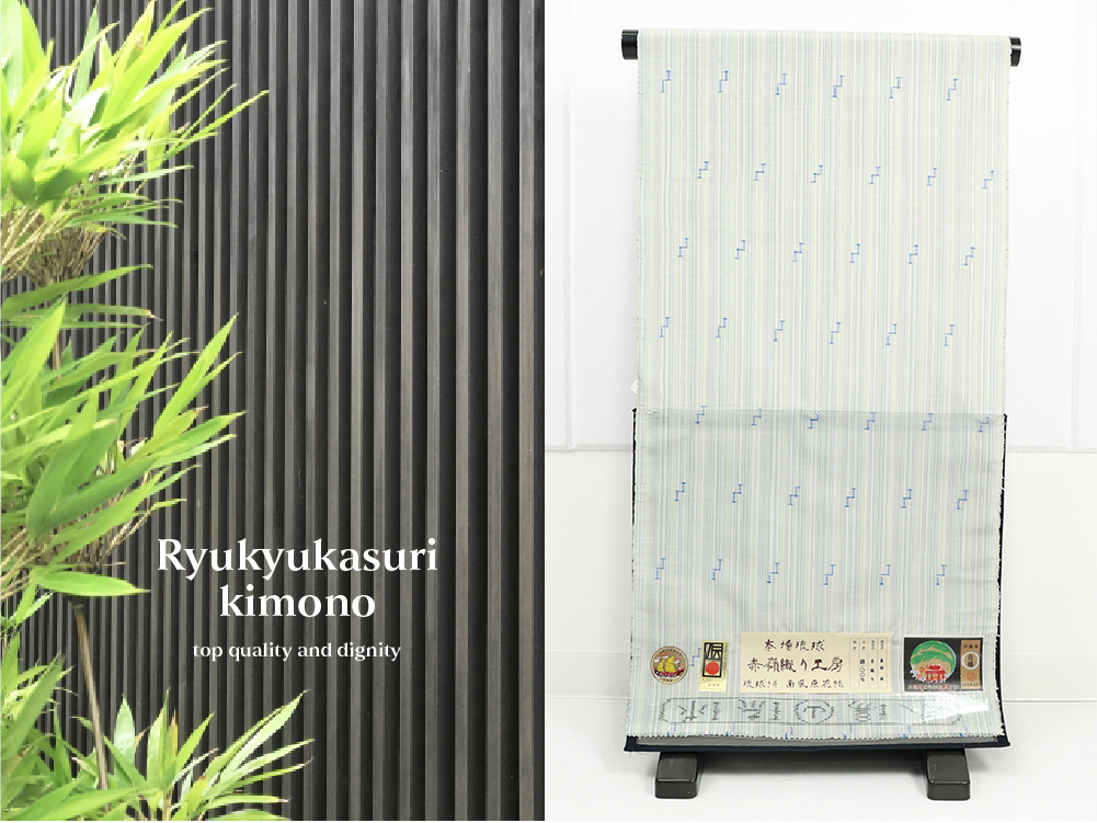 伝統的工芸品 琉球かすり 正絹 着物 縞 白×緑系