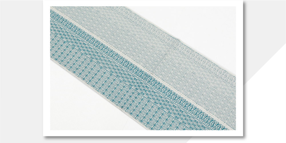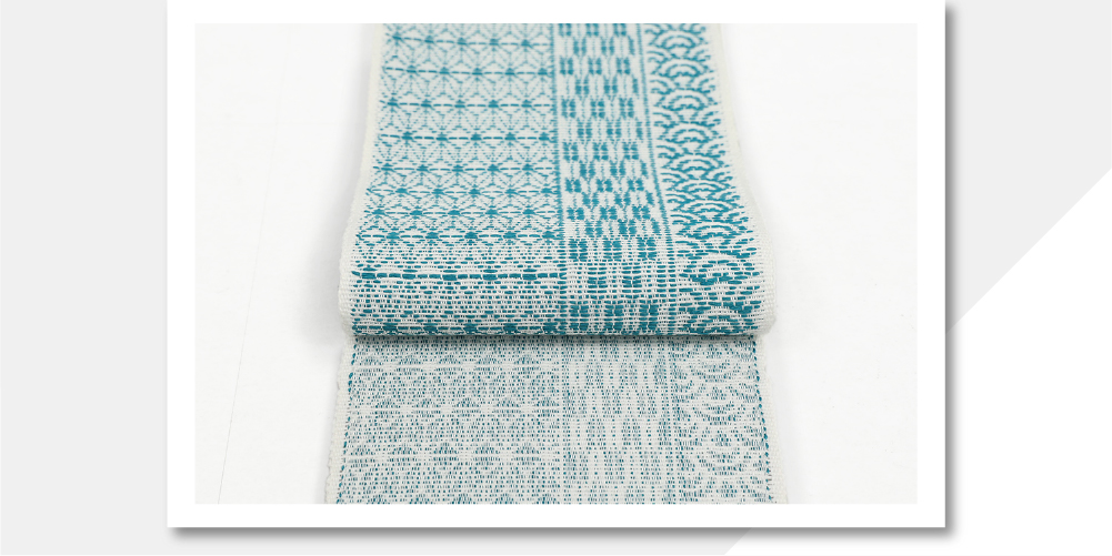 米沢織 近賢織物 麻 半幅帯 シャンヴル 刺し子 寄せ模様 横段 白×青緑