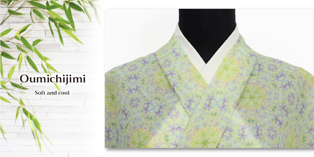 近江ちぢみ MoMo 本麻 夏着物 広幅 楊柳 プリズムガーデン 黄緑