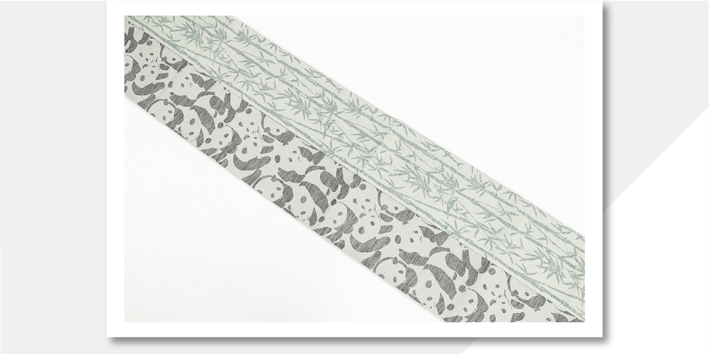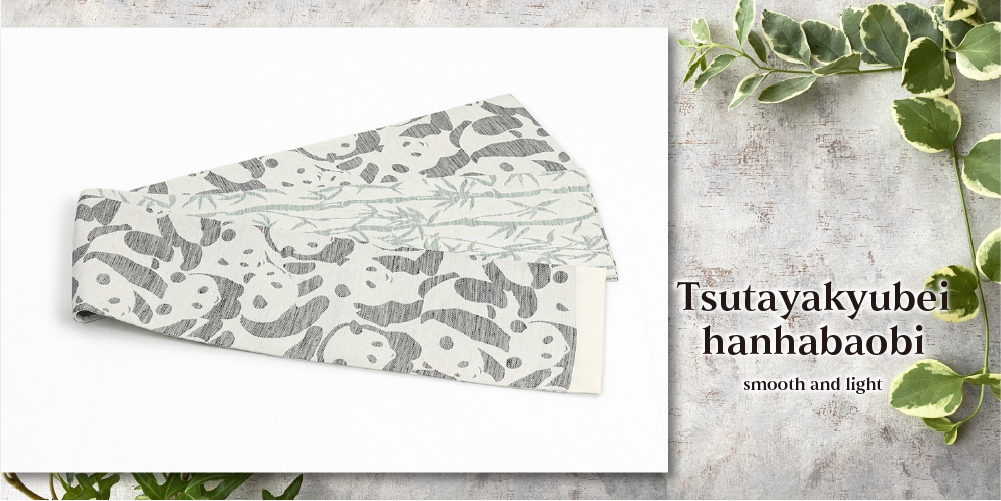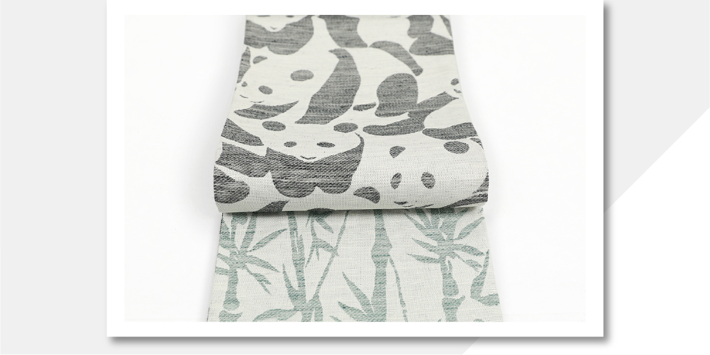 西陣織 蔦屋久兵衛 絹麻 両面半幅帯 パンダ 笹 灰×緑