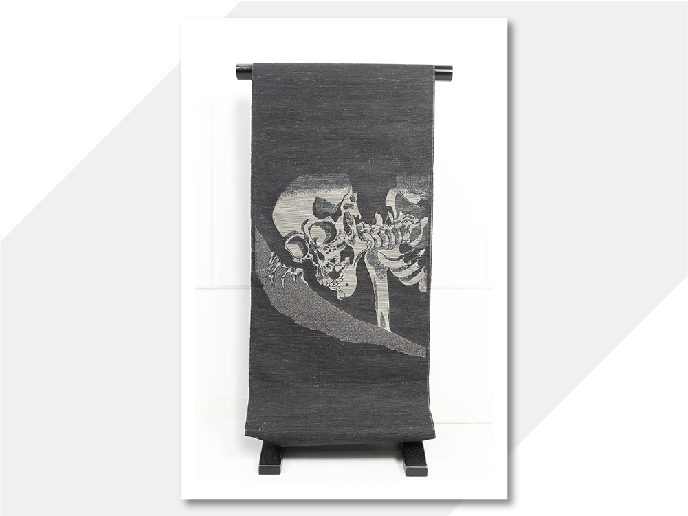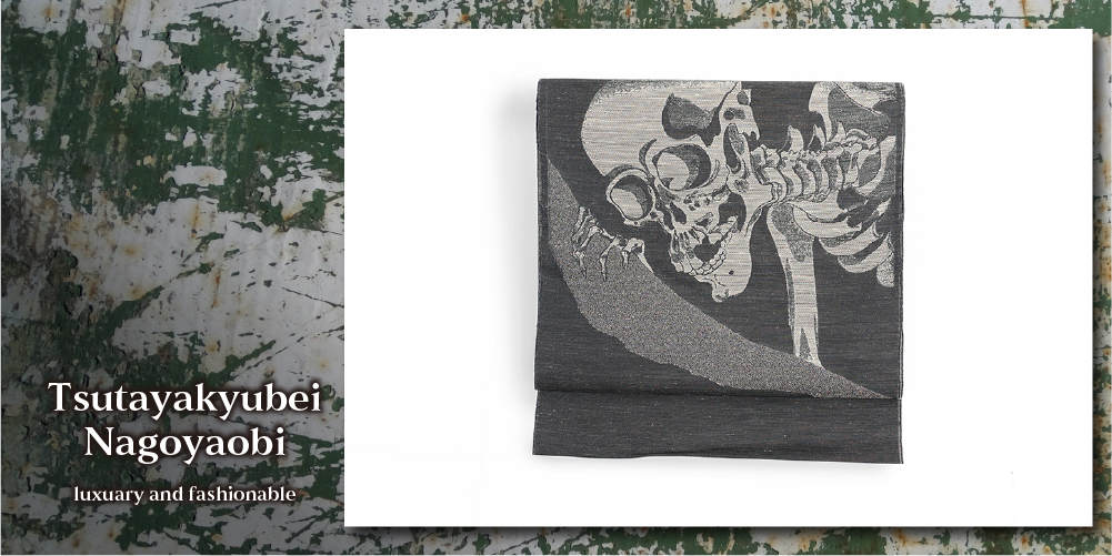 浮世絵師・歌川国芳が描いた餓者髑髏(がしゃどくろ)の名古屋帯です。