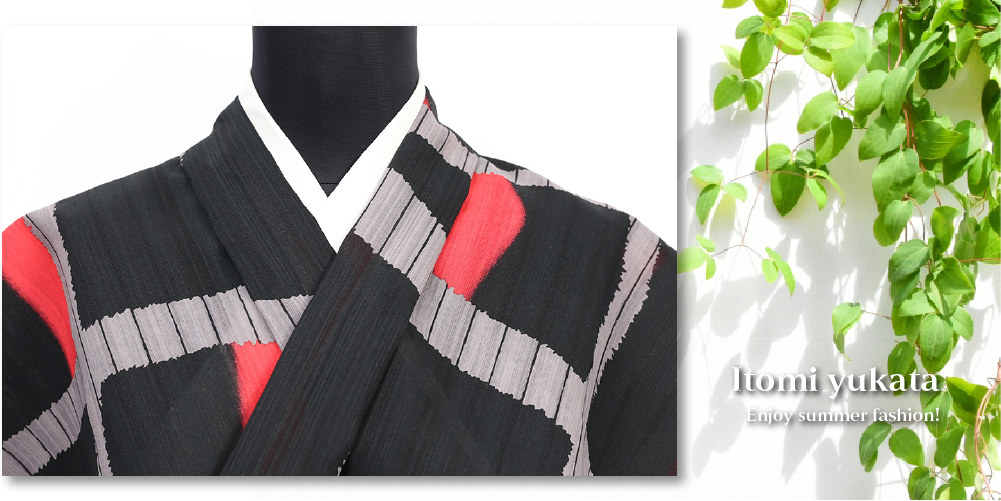 井登美 itomi 浴衣(ゆかた) 優華壇 綿 斜枠暈し 灰に黒赤◆男女兼用◆