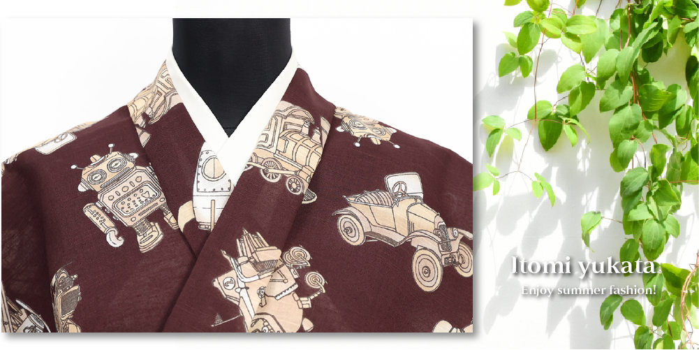 井登美 itomi 浴衣(ゆかた) 優華壇 綿 ブリキ玩具の世界 セピア ◆男女兼用◆