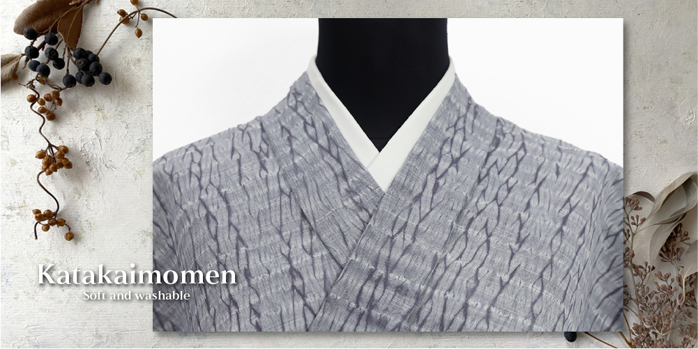片貝木綿 木綿着物 紺仁工房 普段着きもの 縫締め絞り 杢目絞り 灰色