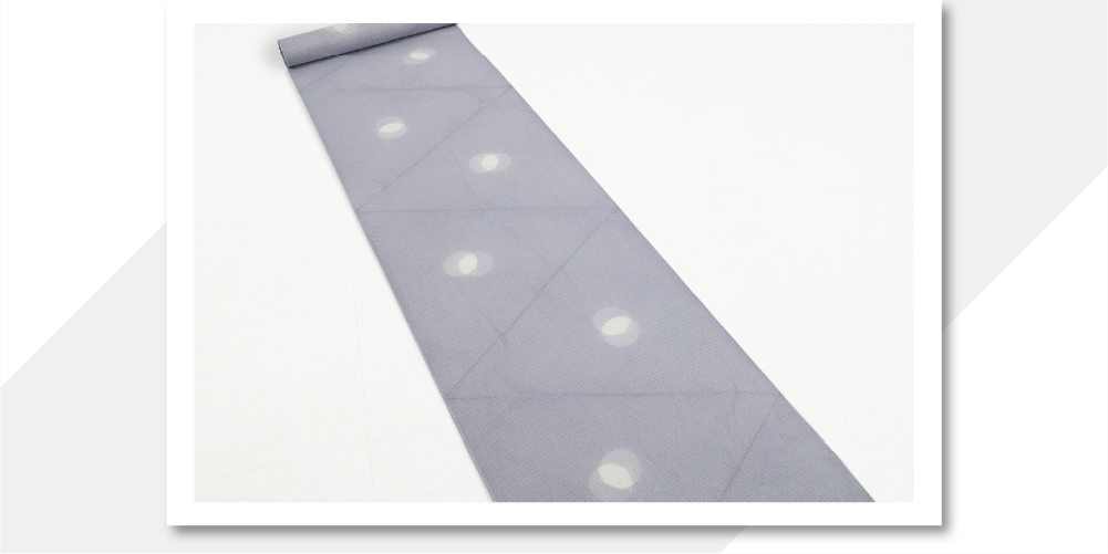 透け感の美しい紅梅生地に、絞り染めでほどこされた柄が並びます。